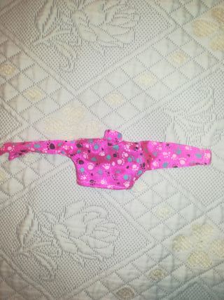 Camisola Rosa para Boneca, última fotografia demonstra como fica no corpo de uma Boneca Barbie dos anos 90. Tem vários pontos com zonas descosidas, conforme as fotografias