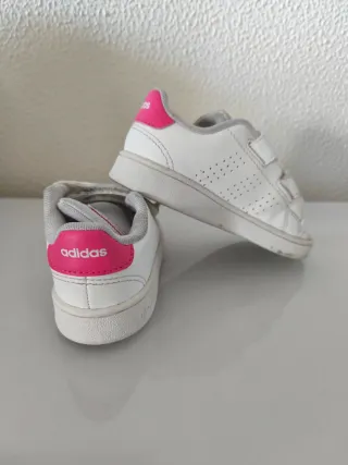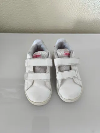 Sapatilhas Adidas em branco com detalhes em rosa, perfeitas para os mais pequenos. Tamanho 24 - Fecho de velcro para ajuste fácil. - Design desportivo e confortável. - Logo Adidas na lateral e na língua.