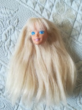 Cabeça Boneca Barbie Hollywood Hair Deluxe (Ref. 10928) de 1993, cabelo precisa de um tratamento para ficar liso e brilhante. Um dos brincos tem a tinta a sair ligeiramente. Tem uma pequena pinta na bochecha do lado direito (não experimentei tirar). Não tenho certeza se tem alguns milímetros do cabelo cortado face ao original Não tem o pino na cabeça.