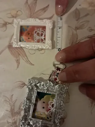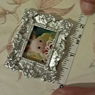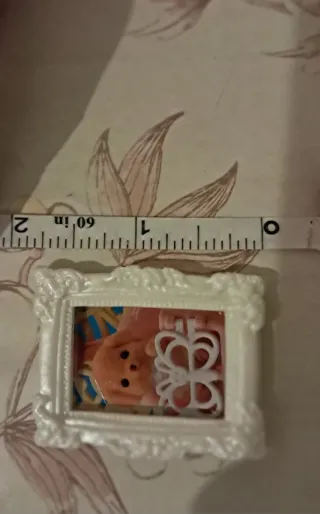 Adorável pequeno quadro decorativo, perfeito para casas Sylvanian Families. Uma peça charmosa para adicionar um toque especial à sua coleção. - Design delicado com moldura branca. - Detalhe de laço na parte superior.