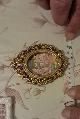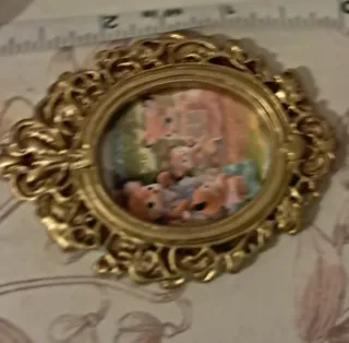 Quadro decorativo em miniatura, perfeito para casas Sylvanian Families. Possui um acabamento dourado detalhado. - Design oval com moldura ornamentada. - Imagem interna com ursinhos. - Ideal para colecionadores.