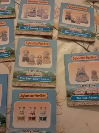 Conjunto de livrinhos da coleção Sylvanian Families. - Livro: Snow Leopard Family - First Camping Trip - Livro: Goat Family - The Little Postwoman - Livro: Sheep Family - The Best Ballet Dancer - Livro: Sea Otter Sisters - Splashy Snorkel