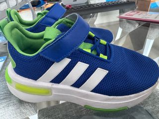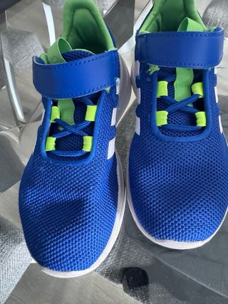 Sapatilhas desportivas em azul com detalhes em verde. - Fecho de velcro. - Três riscas Adidas brancas na lateral. - Sola branca com detalhes em verde e amarelo. - Interior em malha verde. número 31