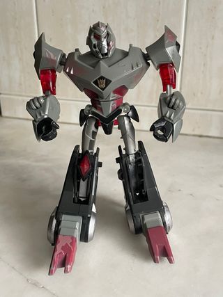 Figura de acción del personaje Megatron de Transformers. Detalle del símbolo Decepticon en el pecho. com sinais de uso e a faltar alguns acessórios. ideal para completar coleções Transformers the Battle begins - Color gris metálico con detalles en rojo. - Brazos y piernas articulados.