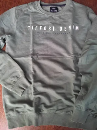 Camisola Tiffosi Denim em tamanho 11-12 anos. Cor verde militar. - Gola redonda. - Manga comprida. - Acabamento canelado na gola, punhos e bainha.