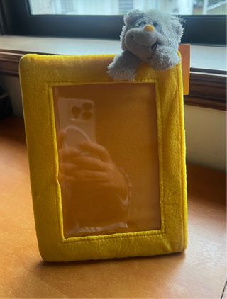 Moldura de pelúcia amarela com um boneco. - Boneco de pelúcia cinza. - Moldura em tecido felpudo amarelo. - Compartimento para foto.