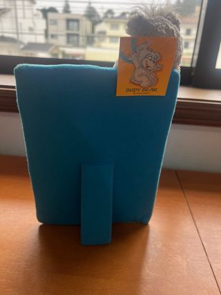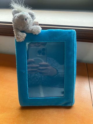Porta-retrato infantil em veludo azul com um adorável boneco. - Acabamento em veludo. - Detalhe de boneco. - Moldura para fotos