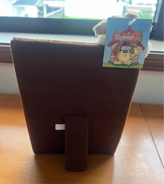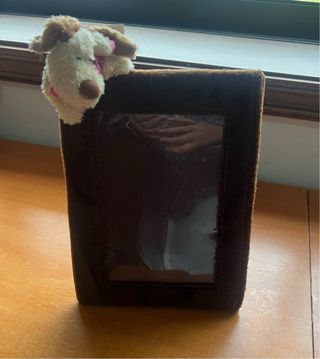 Porta-retrato com um adorável boneco de cachorro. - Revestimento em tecido castanho.
