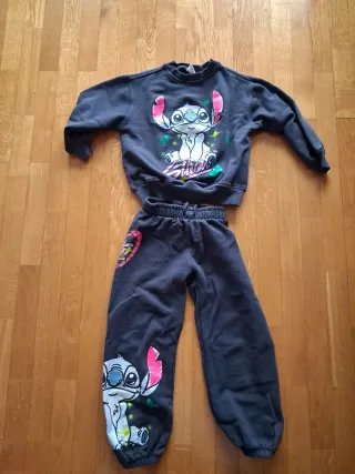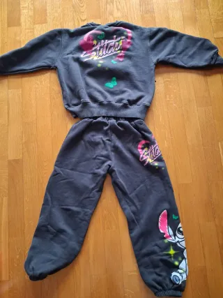 Conjunto de fato de treino com o Stitch da Disney. Inclui camisola e calças. - Camisola com estampado do Stitch e borboletas. - Calças com estampado do Stitch e coração.