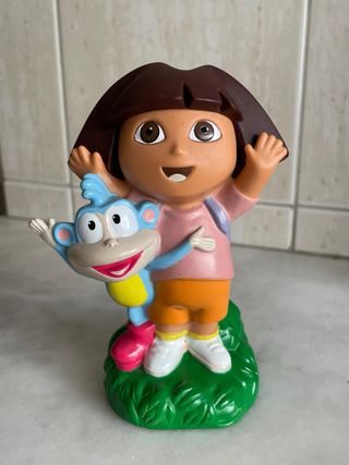 Figura colecionável da Dora, a Aventureira, com seus amigos Botas e o Macaco. - Personagens coloridos e detalhados. - Base com tema de grama verde.