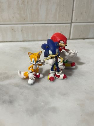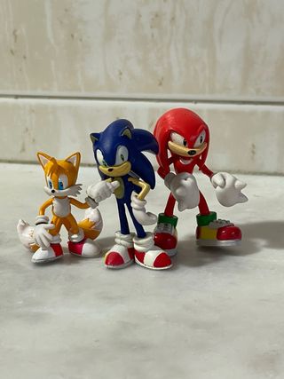 Conjunto de figuras dos personagens Sonic, Tails e Knuckles. - Figura do Sonic em azul. - Figura do Tails em amarelo com duas caudas. - Figura do Knuckles em vermelho com luvas.