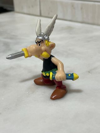 Figura coleccionável do personagem Asterix. - Detalhes em preto, verde e amarelo na túnica. - Calças vermelhas e sapatos castanhos. - Capacete prateado com duas pontas. - Segura uma espada e um objeto azul.