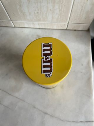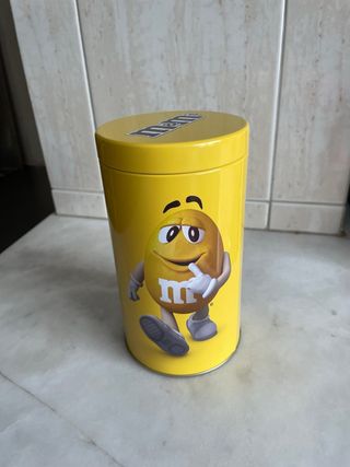Lata colecionável da M&Ms, com a cor amarela vibrante e o personagem icônico. - Design temático da M&Ms. - Tampa superior. - Material: Metal.