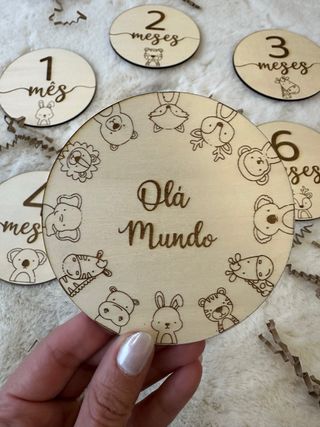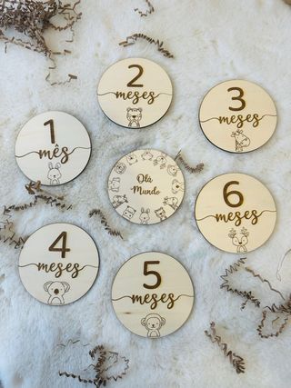 Conjunto de 7 placas redondas de madeira para registar os meses do bebé. Perfeitas para fotos e recordações. - Material: Madeira - Tamanho: 9,5cm diâmetro - Design com animais e texto em português - Inclui 7 placas: Olá Mundo | Informação bebé 1 Mês | 7 Meses 2 Meses | 8 Meses 3 Meses | 9 Meses 4 Meses | 10 Meses 5 Meses | 11 Meses 6 Meses | 12 Meses