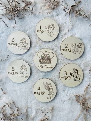 Conjunto de 7 placas de madeira para registar os marcos do bebé. Perfeitas para fotos e recordações. - Tema: Disney - Tamanho: 9,5cm diâmetro - Material: Madeira Placas: Placa Olá Mundo | Informação bebé 1 Mês | 7 Meses 2 Meses | 8 Meses 3 Meses | 9 Meses 4 Meses | 10 Meses 5 Meses | 11 Meses 6 Meses | 12 Meses