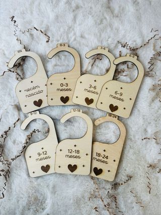 Conjunto de 7 separadores de roupa para bebé em madeira. - Inclui tamanhos RN, 0-3 meses, 3-6 meses, 6-9 meses, 9-12 meses, 12-18 meses e 18-24 meses. - Tamanho: 13cm altura x 4cm largura - Material: Madeira.