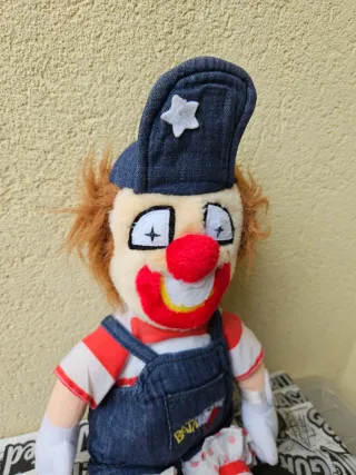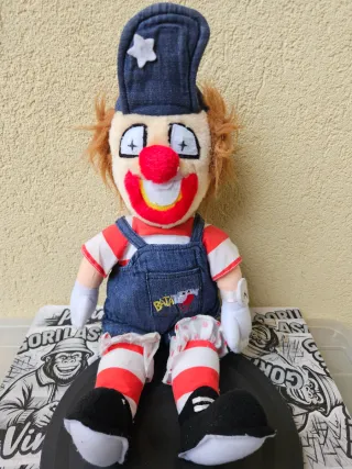 Peluche vintage do Batatoon com cerca de 48 cm de altura. Uma peça divertida e colecionável. - Design de palhaço característico. - Detalhes em ganga e tecido. - Cores vibrantes e alegres.