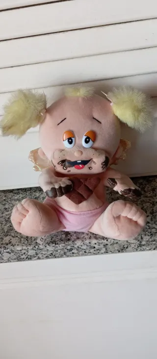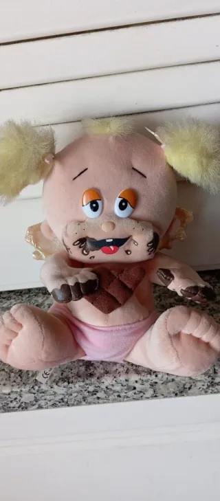Peluche adorável com design de anjo e detalhes de chocolate. - Material de pelúcia macio. - Detalhes de chocolate aplicados. - Cabelo loiro em forma de rabos de cavalo. - Roupa interior rosa.
