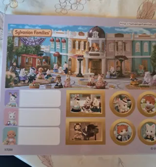Folha de autocolantes da Sylvanian Families, com várias personagens e cenários da linha Town. Tamanho: 7,5× 5cm - Inclui autocolantes de diferentes tamanhos e formatos. - Ideal para decorar cadernos, álbuns ou outros objetos. - Personagens representadas incluem coelhos, gatos e outros animais. - Motivos de lojas e elementos urbanos.
