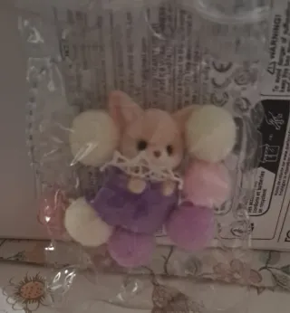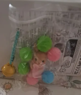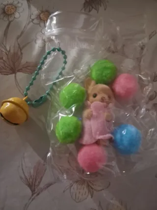 Charm Sylvanian Families com um pequeno coelho e bolas coloridas. - Inclui um coelho com vestido rosa. - Três bolas verdes. - Duas bolas cor-de-rosa. - Uma bola azul. - Um sino amarelo com corrente.