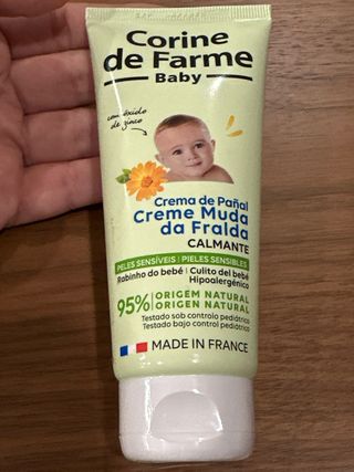 Corine de Farme Baby Creme de Muada Calmante, um creme calmante e protetor para a zona da fralda do bebé, com 95% de ingredientes de origem natural, hipoalergénico e testado sob controlo dermatológico.