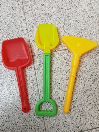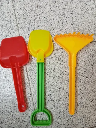 Conjunto de brinquedos de praia em plástico. - Um ancinho azul. - Uma pá verde. - Uma pá vermelha.