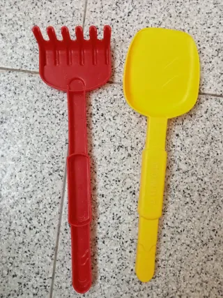 Conjunto de pá vermelha e escavadora azul para brincar. - Pá vermelha com a marca MONDO. - Escavadora azul com a marca SMOBY. - Brinquedos de plástico resistentes.