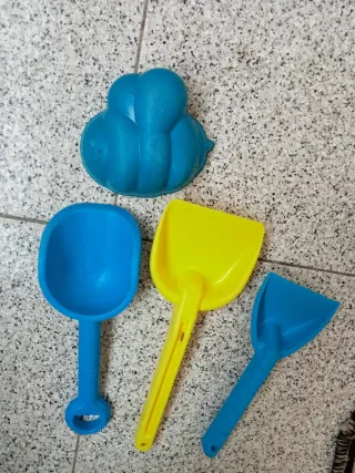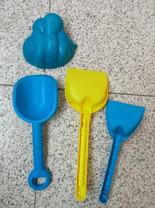 Conjunto de 4 brinquedos para brincar na praia. - 1 molde azul em forma de abelha. - 1 pá azul. - 1 pá amarela. - 1 pá azul menor.