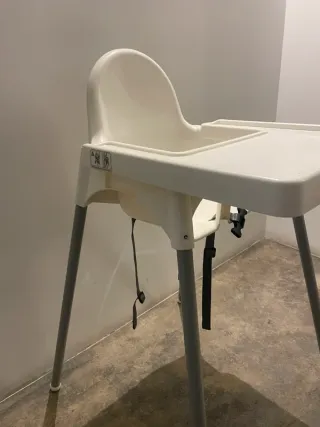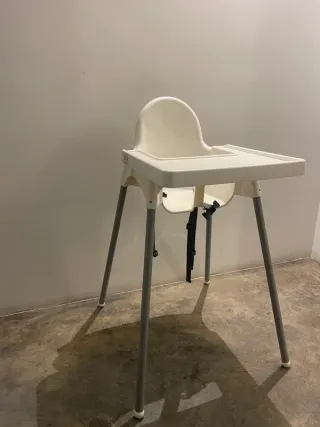 Cadeira de refeição para criança em branco. - Assento e tabuleiro em plástico. - Pernas em metal. - Cinto de segurança incluído.