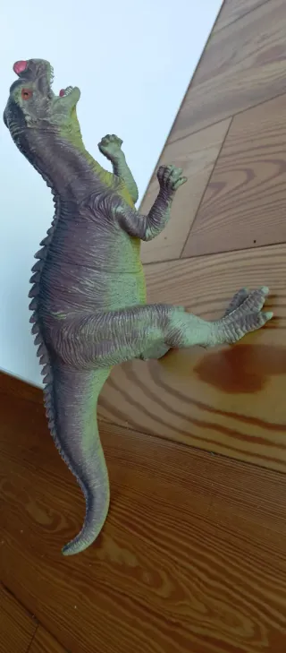 Figura de dinossauro antiga, com um design vintage e cores vibrantes. - Cores: verde, azul e rosa. - Material: plástico.