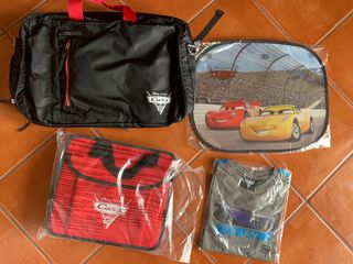 Conjunto de artigos Cars 3 - Disney (Filme Carros) 1 tapa sol 1 T-shirt 1 organizador com compartimento hermético 1 mochila/saco versátil