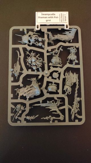 Conjunto de miniaturas Warhammer Age of Sigmar, incluindo um Shaman e um Grot com pote. As miniaturas estão em plástico cinza, prontas para montagem e pintura. - Inclui todas as peças mostradas na imagem. - Ideal para expandir seu exército de Age of Sigmar.