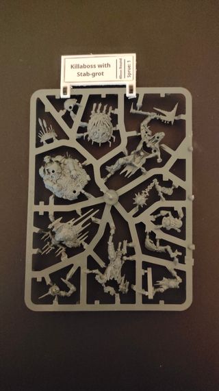 Conjunto de miniaturas da Warhammer Age of Sigmar, incluindo um Killaboss e um Stab-grot. As peças estão em plástico cinza, prontas para montagem e pintura. - Inclui todas as peças mostradas na imagem. - Ideal para expandir seu exército Orruks.
