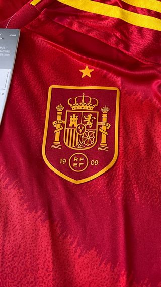 Camisola oficial da seleção espanhola de futebol, modelo 2025. - Cor vermelha com detalhes em amarelo. - Logo da Adidas e emblema da seleção bordados. - Tecnologia AEROREADY para maior conforto.
