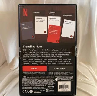 Jogo de festa Trending Now da Netflix, publicado pela Spin Master. Ideal para noites divertidas com amigos. - Jogo de festa original da Netflix. - Para 3-10 jogadores. - Duração aproximada de 20 minutos. - Recomendado para maiores de 14 anos.