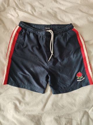 Calções de banho azul marinho com detalhes em vermelho e branco. Em bom estado. - Tamanho 13 - Detalhes laterais em vermelho e branco - Etiqueta da Inglaterra com rosa bordada