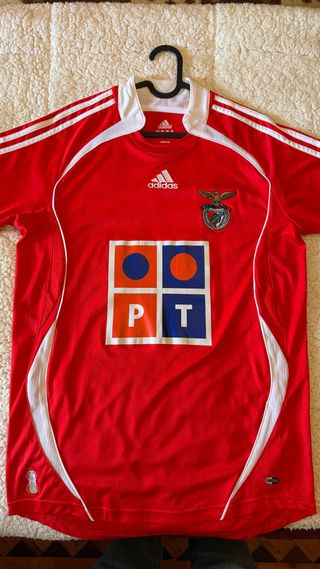 Camisola oficial do Sport Lisboa e Benfica da época 2006/2007. - Design clássico em vermelho com detalhes brancos. - Logo da Adidas e emblema do clube bordados. - Patrocínio PT no centro.