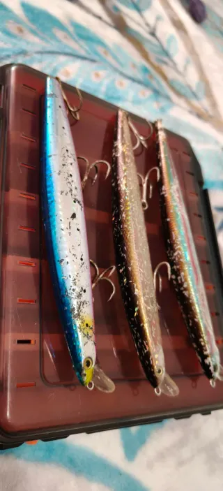 Conjunto de amostras para pesca spinning. Shimano silent assasin 160mm red gold- 17.5€ Shimano silent assasin 160mm sardine noir- 20€ Shimano silent assasin 160mm iwashi - 12€ (usada em bom estado com alguma tinta riscada das fateixas mas todas com êmbolos bons)
