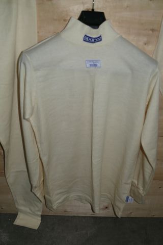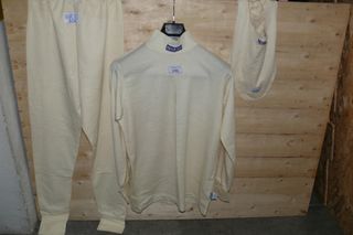 Conjunto de vestuário Sparco em creme, composto por gorro, calças e camisa de manga comprida. Kit completo de Gorro, Calças e Camisa de manga comprida Sparco Smooth Nomex na cor branca. Em conformidade com a norma FIA 8856-2000. Usado sem defeitos ou falhas. Completo Originais - Gorro com logótipo Sparco. - Calças com cintura elástica. - Camisa de manga comprida com gola alta e logótipo Sparco.