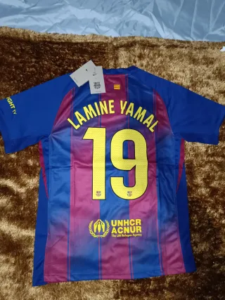 Camisola do FC Barcelona, com o nome e número do jogador Lamine Yamal. - Cor azul e grená. - envio rápido e bem embalado. - Tamanho M. - Envio em 24h - Respondo rápido!!