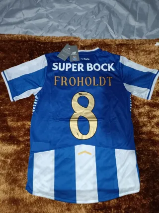 Camisola de futebol do FC Porto, com o nome Froholdt e o número 8. - Cor azul e branca. - Logo Super Bock na frente. - Detalhes em dourado no número e nome. - Envio rápido e bem embalado. - Envio em 24h - Tamanho M