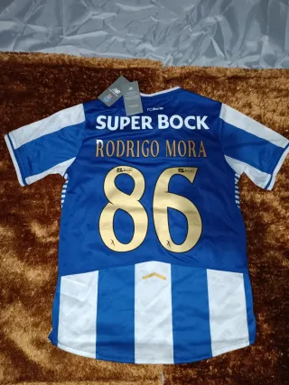 Camisola de futebol do FC Porto, com o nome e número do jogador Rodrigo Mora. - Cor azul e branca. - Nome: RODRIGO MORA. - Número: 86. - Patrocinador: SUPER BOCK. - Tamnho M. - Envio rápido e bem embalado. - Envio em 24h. - Respondo rápido!!