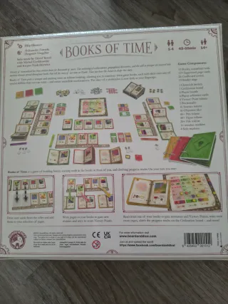 Jogo de tabuleiro Books of Time, criado por Filip Głowacz. - Jogo para 1-4 jogadores. - Idade recomendada: 14+. - Duração: 45- min. - Modo solo por David Turczi. - Com Michał Cieślikowski e Kacper Frydrykiewicz. Inclui promo
