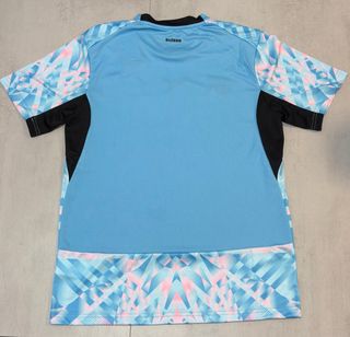 Camisola alternativa da Suíça, com um design moderno e arrojado. - Padrão geométrico em tons de azul e rosa. - Detalhes em preto nas laterais e mangas. - Logótipos - Escudo da Suíça aplicado no peito.