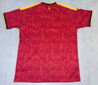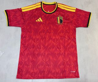 Camisola da Bélgica, equipamento principal. - Design com padrão de chamas. - Logo - Escudo da seleção belga.