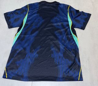 Camisola alternativa da seleção do Brasil, com design moderno e detalhes vibrantes. - Cor principal azul-marinho com grafismos em azul. - Detalhes em amarelo e verde nas laterais. - Gola redonda com acabamento em azul.