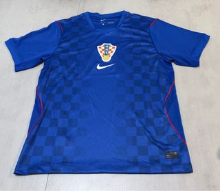 Camisola alternativa da Croácia, tamanho L. Design com padrão xadrez. - Cor azul. - Logo. - Escudo da seleção.
