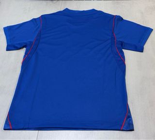 Camisola desportiva de cor azul. - Escudo do clube em destaque. - Detalhe de número '90' na gola. - Logótipo da marca visível. - Tamanho L