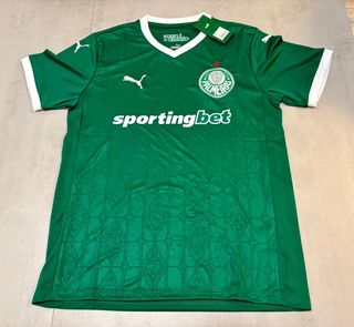 Camisola do Palmeiras, tamanho L. Peça em verde com detalhes em branco e o escudo do clube. - Logo. - Patrocínio sportingbet estampado. - Design com padrão geométrico sutil.