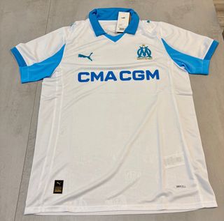 Camisola do Marselha, tamanho L. Perfeita para fãs de futebol. - Cor branca com detalhes azuis. - Logótipo no peito esquerdo. - Emblema do clube no lado direito. - Patrocínio CMA CGM na frente.
